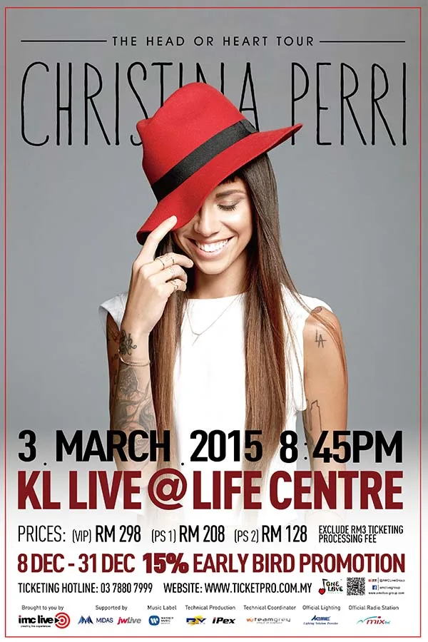 Tickets for Christina Perri’s “The Head of Heart Tour” in Malaysia are priced at RM128 (PS2 zone), RM208 (PS1 zone), and RM298 (VIP zone). Fans can buy their tickets online via TicketPro or call 03 7880 7999.