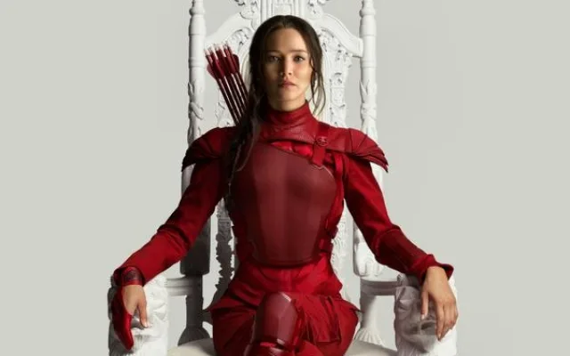 Jennifer Lawrence, who is portraying Katniss Everdeen in the movie, attended Lionsgate’s Comic-Con 2015 panel in San Diego alongside her fellow cast members and director Francis Lawrence for a Q&A session. A new footage from the film was unveiled as well, but first, take a look at the new poster that shows Lawrence’s Katniss rocking a red suit while sitting on a white throne.