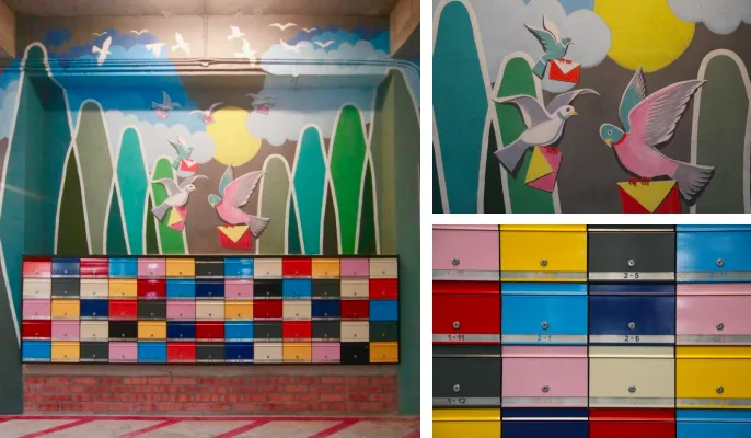 • Art description: This mural art, created at the colourful mailbox area, depicts the story of Pigeon Post of using homing pigeons to carry letters and messages.
