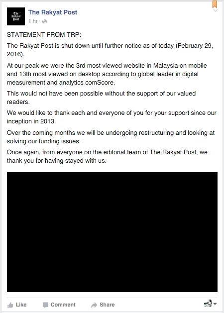 According to The Rakyat Post’s statement, the news portal will be shut down until further notice as of today. The Facebook post also said that in the coming months, the company will be “undergoing restructuring” and looking at solving their funding issues.
