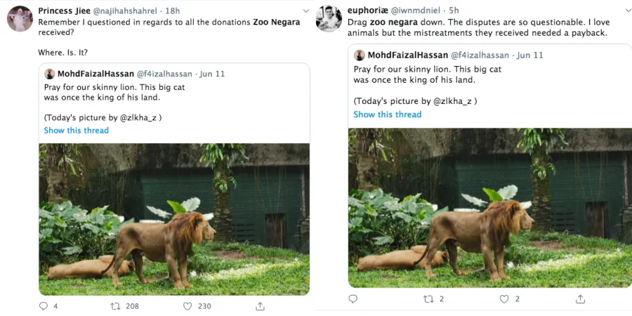 The rage doesn’t stop there! One Twitter user known as @sunfloweraidil recently launched a petition which calls for Zoo Negara to be investigated for “its lack of transparency and underwhelming performances on its workers and the animals they take care of.”