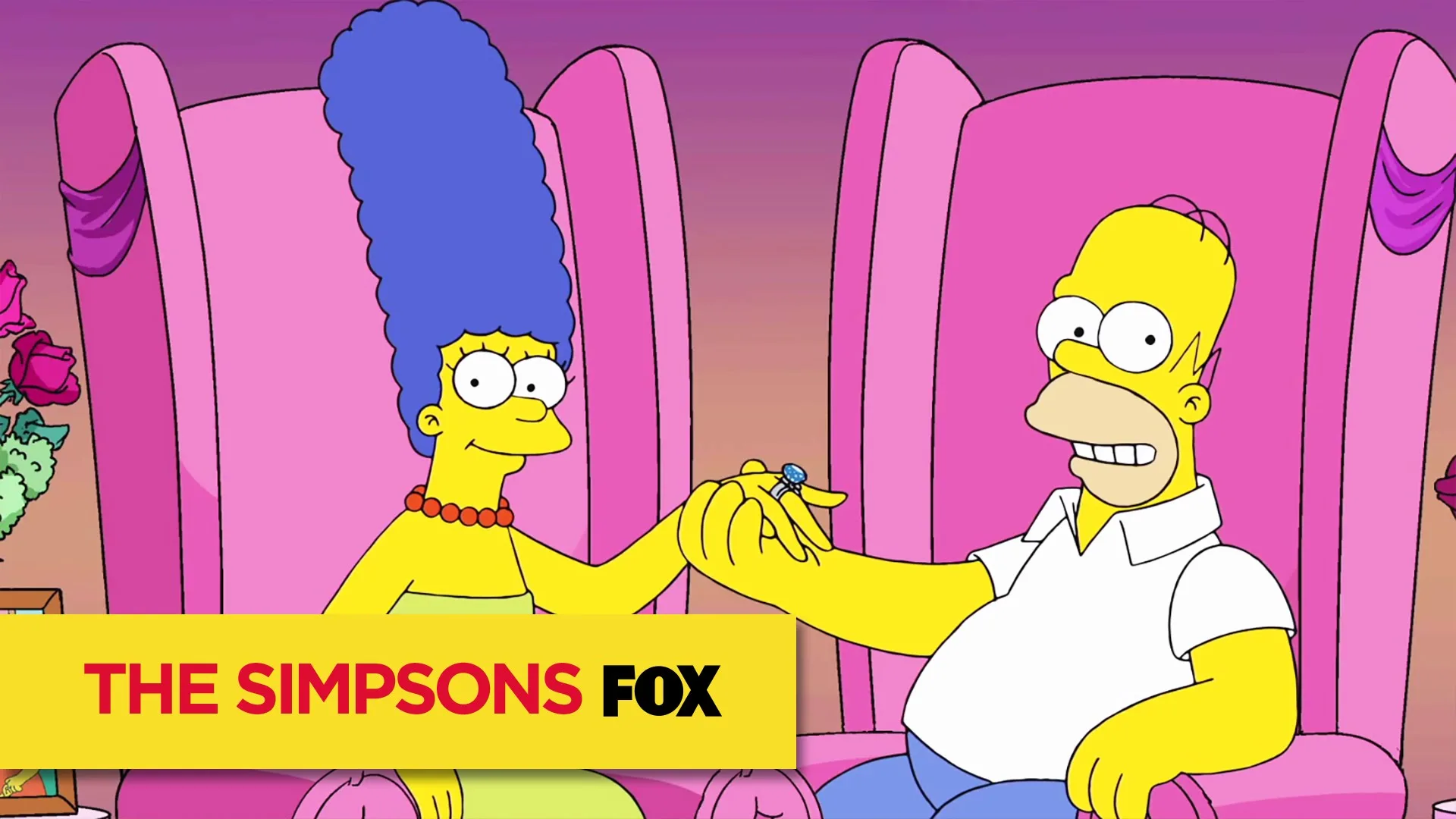 Marge immediately cut him off, warning that he shouldn’t talk about that matter in front of the whole world. Homer got down on one knee to apologise and proclaim his love to her, but Maggie who was dressed as cupid accidentally shot her dad in the eye with the plunger arrow.