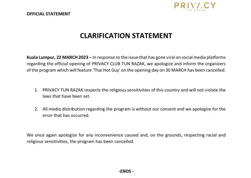 In response to the public outrage and orders from the Royal Malaysia Police (PDRM), Privacy Club officially cancelled the program and issued a statement on Facebook to clarify that they respect religious sensitivities and will not violate the laws that have been set. “We once again apologise for any inconvenience caused, and on the grounds, of respecting racial and religious sensitivities, the program has been cancelled,” the bar wrote.