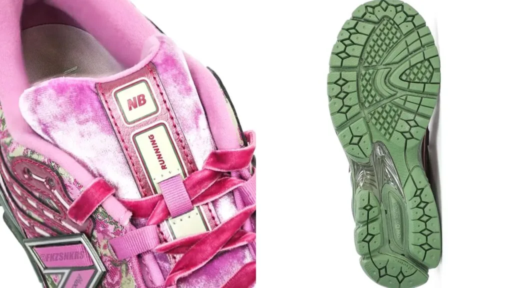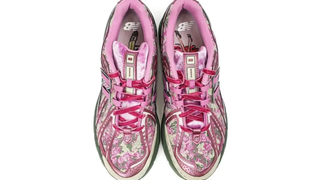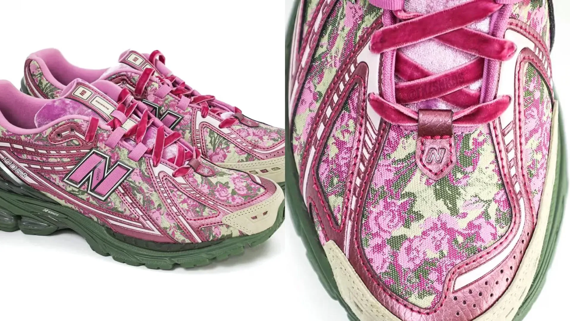 Firstly, the shoe features a cotton textile upper with an all-over, embroidery-style floral print overlaid with pink leather. Upon closer inspection, you will notice the body is absolutely covered in pink floral motifs on an off-white backdrop. Because of this, the shoe has been aptly named the 1906R “Rose Runner.”