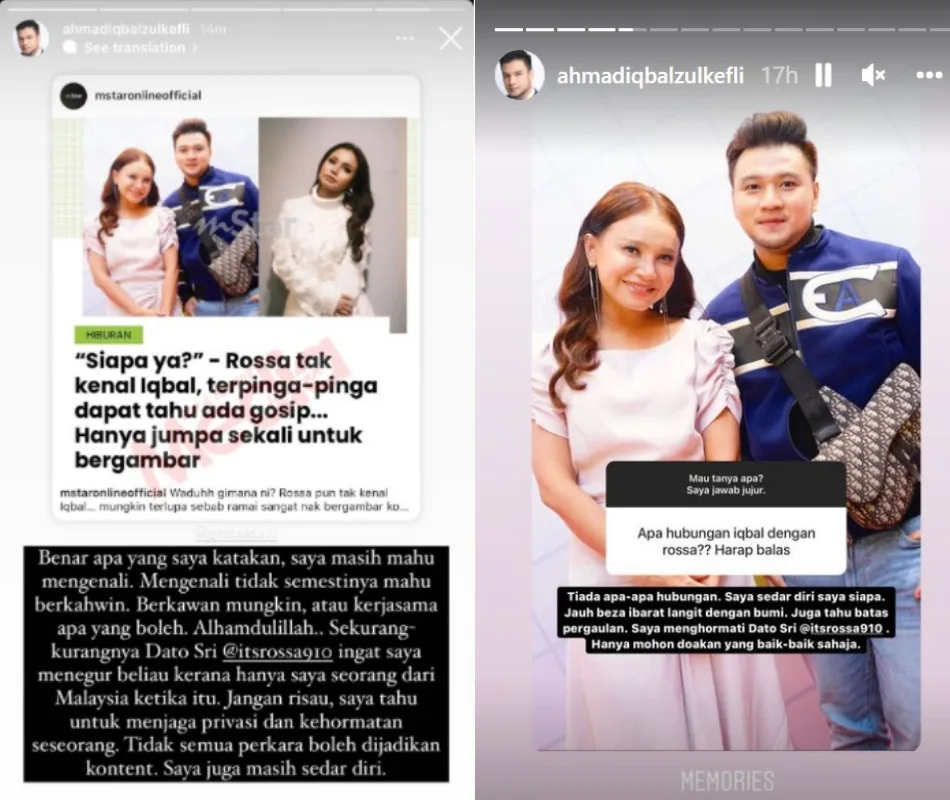 “I realise who I am,” Iqbal wrote in his subsequent post. “Datuk Seri @itsrossa910 and I are two completely different people. I also know my limits. I have great respect for her. Just pray for the best.”