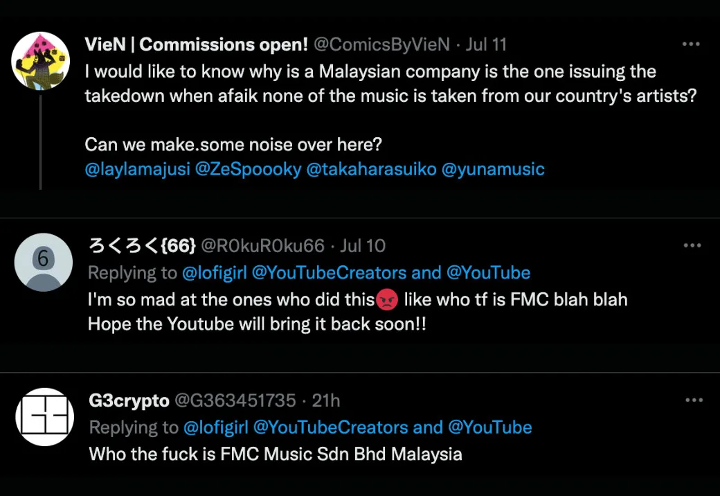 But the majority of Twitter users were baffled and just down right enraged in response to the situation, and honestly same. Because who is FMC Music and why have they reported Lofi Girl for copyright to YouTube?