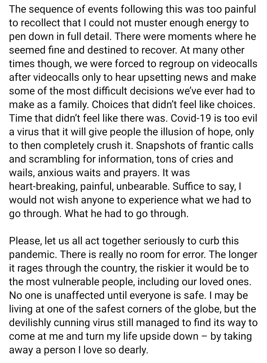 Zalan took to Twitter to tell his family’s story about how Covid stole his father’s life. He cited what he’d written as the “most difficult piece” he’d ever had to pen. “(I’m) sharing my pain to wake people up,” he said, explaining why he was posting something that is so personal. “Covid-19 is real, and it is much closer to you than you think.”