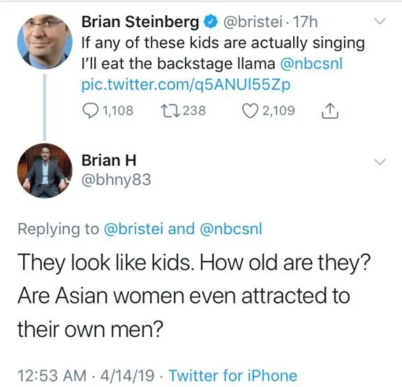 “They look like kids. How old are they? Are Asian women even attracted to their own men?” read the now-deleted tweet by Brian Hughes in respond to another tweet by Brian Steinberg, a TV editor at Variety who commented, “If any of these kids are actually singing I’ll eat the backstage llama.”
