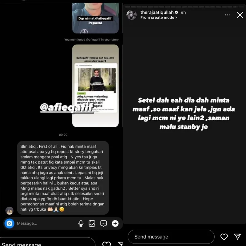 After the story went viral, Raja Atiq posted a screenshot of a conversation he had with @afieqafif, the IG user who slandered him. The DM screenshot showed Afieq apologising to the actor for his actions. Not wanting to drag this out any further, he asked for Atiq’s forgiveness and promised to keep his opinions to himself next time. The young star decided to forgive him and warned others to not repeat his mistake.
