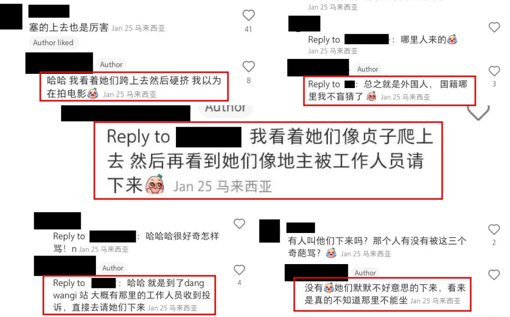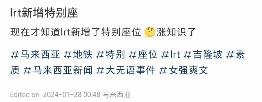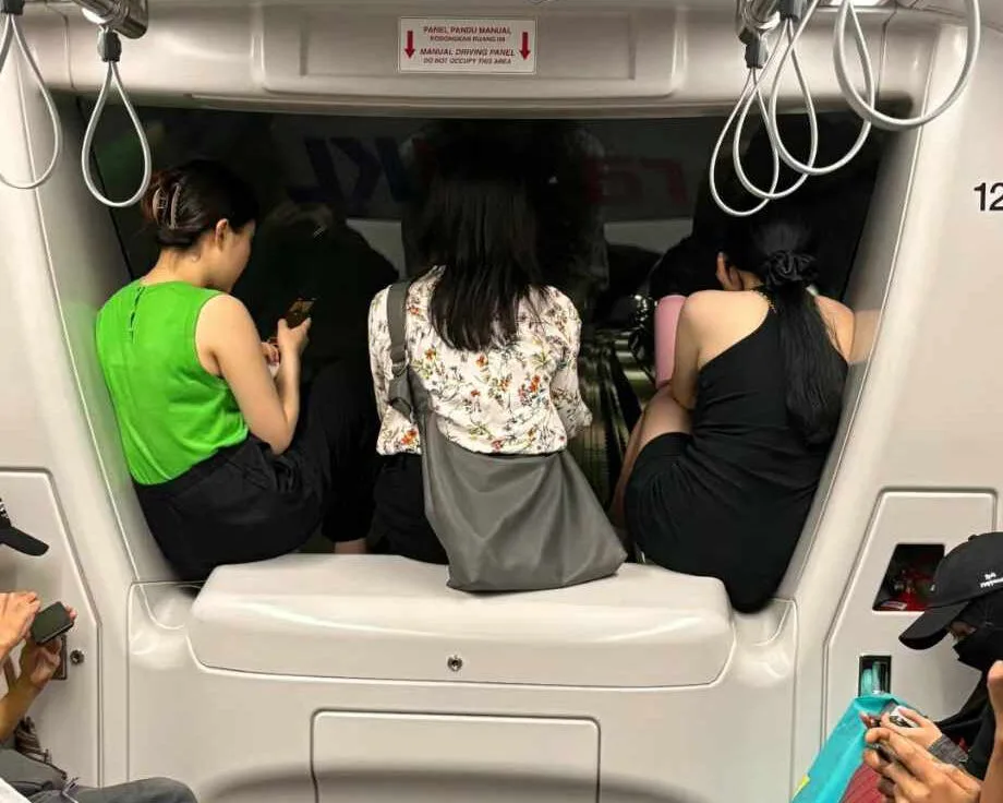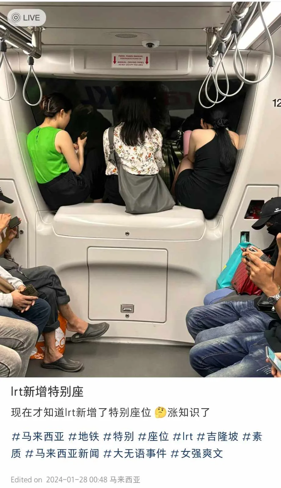 The story was first shared on Xiao Hong Shu (小红书), by a netizen who claimed they witnessed the whole thing. They jokingly alleged that “the LRT has added special seats” and uploaded a photo of three ladies curled up in the nook found at either end of the train and seated on the panel. The netizen alleged that they were foreigners but was unsure of their nationality.