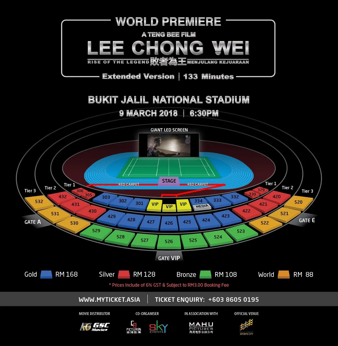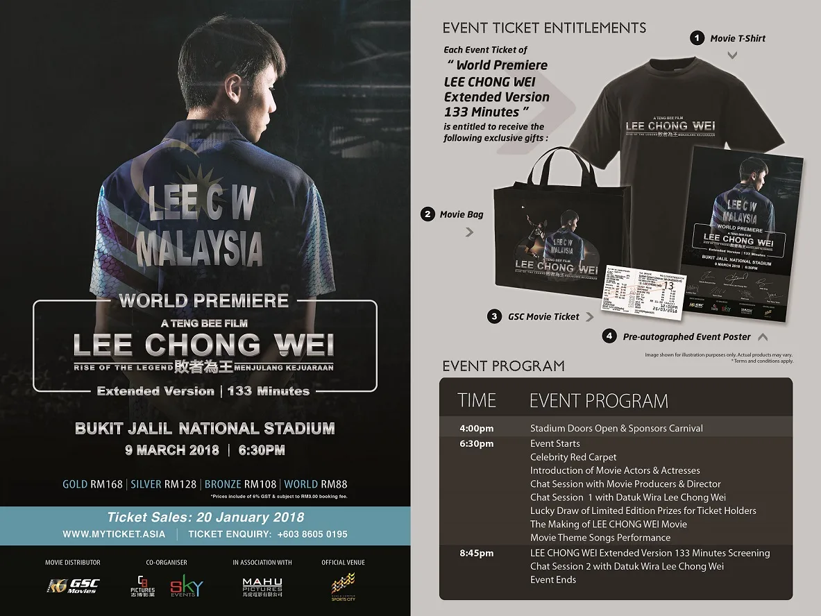 Each purchased ticket comes with one (1) LEE CHONG WEI Movie T-shirt valued at RM59, one (1) GSC Movie Ticket to watch the theatrical version of LEE CHONG WEI movie, one (1) limited edition Movie Poster pre-autographed by Datuk Wira Lee Chong Wei (and other cast members), and one (1) sponsored movie bag. These will be distributed at the National Stadium on Event day with proof of ticket.