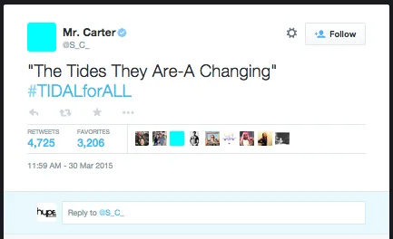 As such, such a mind-blowingly awesome service is already seeing massive support from some of the world’s top artistes. Some have already thrown their support behind TIDAL, changing their Twitter as well as Facebook page display pictues to light blue and tweeting the hashtag #TIDALForAll, starting with Mr. Carter himself.