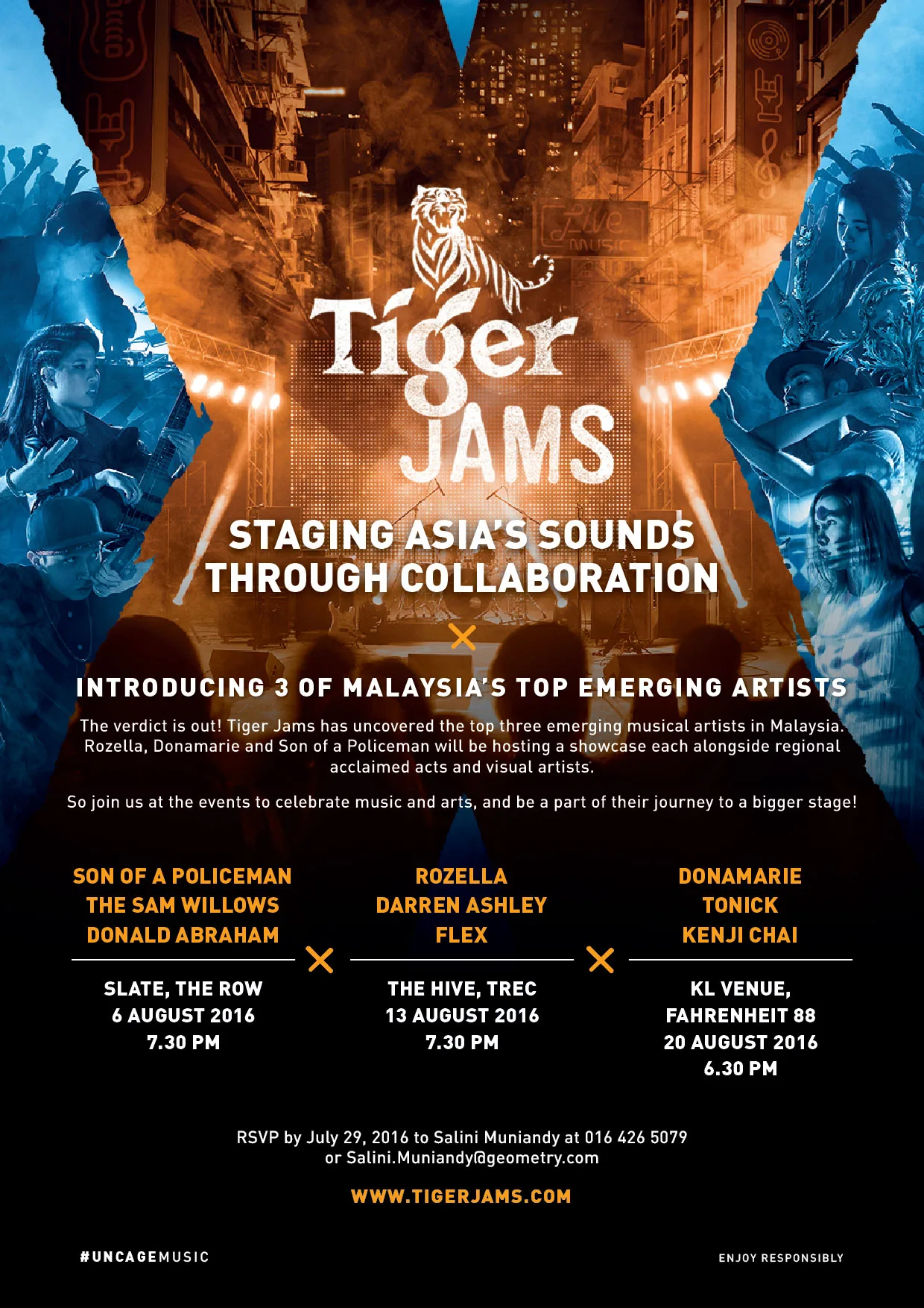 Up next, the bands will each be paired with one acclaimed Asian act (either Singaporean pop band The Sam Willows, Hong Kong’s punk pop band ToNick, or Malaysia’s very own Darren Ashley) and an established visual artist (Donald Abraham, Kenji Chai, or Flex) to produce an original Tiger Jams track and music video. This track with be the deciding factor for the mystery international act to handpick one of the 3 for a collaboration. The 3 finalists will also receive a cash prize of RM15,000 each, and all 3 bands have plans to upgrade their equipment and produce an album with the money.