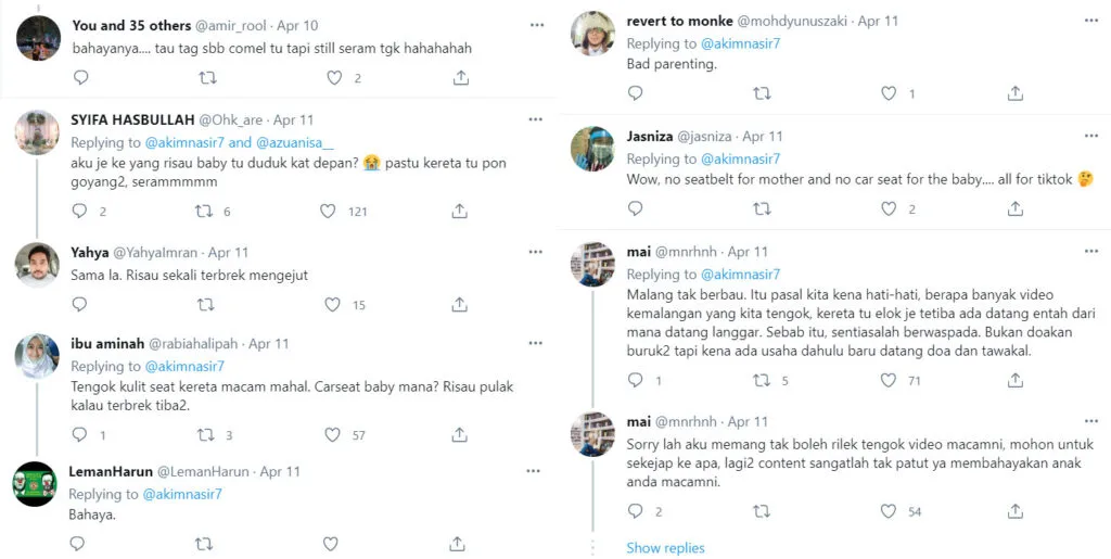 These netizens were not impressed with TikTok user @azlienalegacy blatant disregard for her toddler’s safety. “The car seat seems expensive,” Twitter user @rabiahalipah noted. “Where’s the baby car seat? It would be concerning if the car were to break suddenly.”