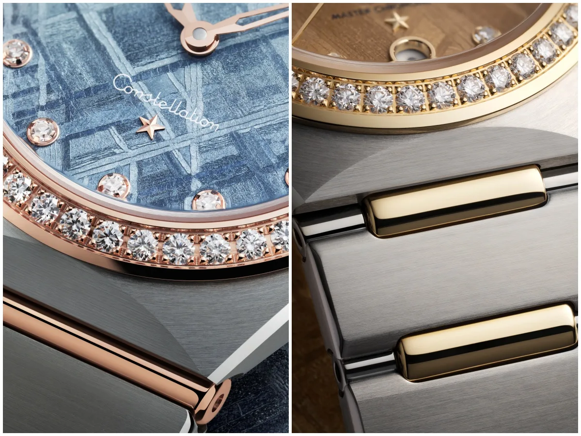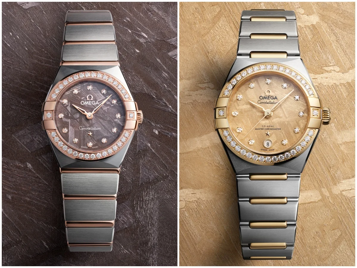 29mm Co-Axial Master Chronometer: Including a bi-colour model crafted from stainless steel and 18K yellow gold. This time, the meteorite dial has been enhanced by a PVD Moonshine™ Gold colour treatment, delivering an astonishing radiance that is complemented by diamond hour markers and a diamond-paved bezel.