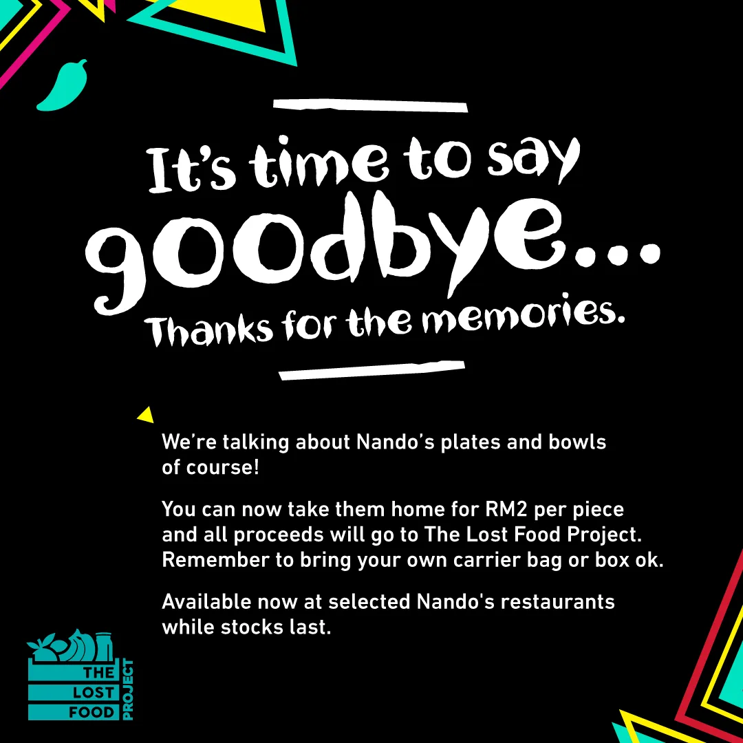 Additionally, Nando’s Malaysia will be selling off their old dishes to the public for price as low as RM2 per piece. As stated on their social media post, “All of the proceeds will go to the The Lost Food Project. Don’t forget to bring your carrier bag or box, okay?”
