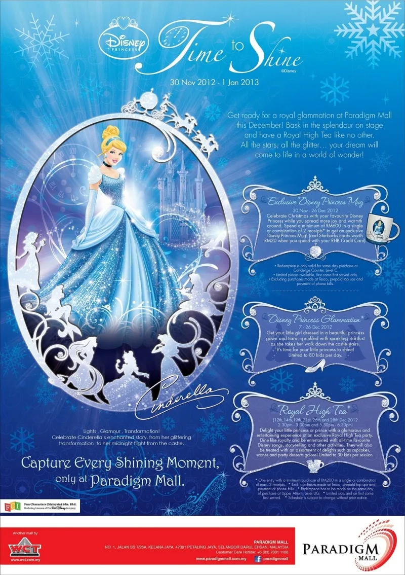 Enchanting fairytales come to life at Paradigm Mall as Disney and Fun Characters International (FCI) present “Time to Shine”. Heralding its first ever festive celebration, Paradigm Mall invites shoppers to indulge in their child’s fantasy and realize their dreams of being a Disney Princess, from 30th November 2012 to 1st January 2013.