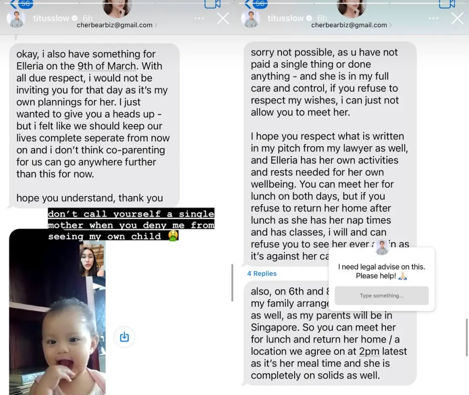 Around midnight (Tuesday, 27th February), Titus Low posted screenshots of his conversation with Cheryl on his Instagram stories to reveal the conflict between the two parents. According to the message seen above, the mother-of-one told her ex-husband that he was not allowed to visit their daughter on a specific date as she had made plans that day.