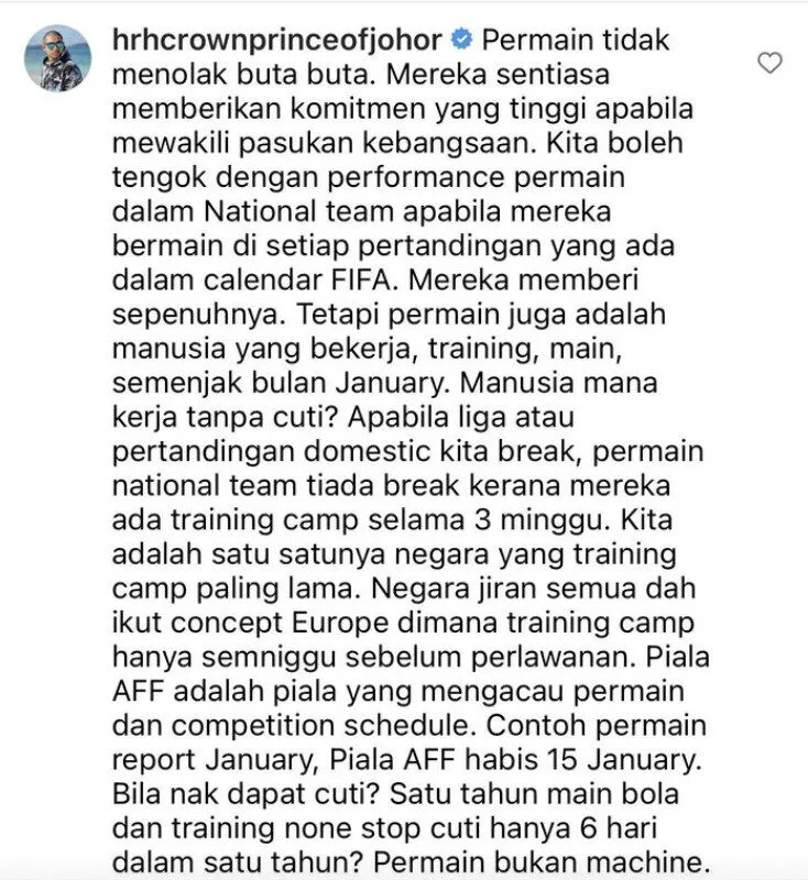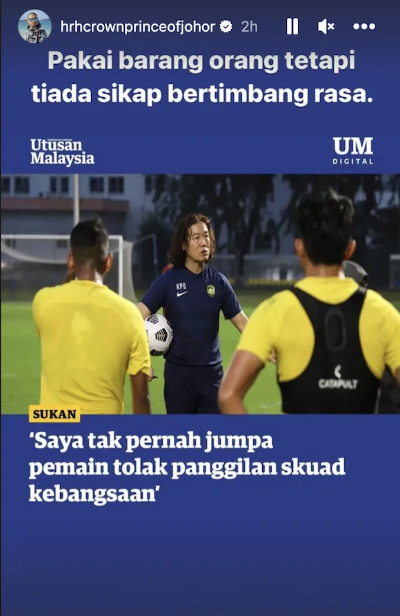 This has also caught the attention of Tunku Mahkota Johor (TMJ), Tunku Ismail Idris. The Johor Prince took to his socials to share his take on Kim’s statement to the press. He wrote on his Instagram Story, “You’re using other people’s stuffs (players), but you’re not being considerate.”