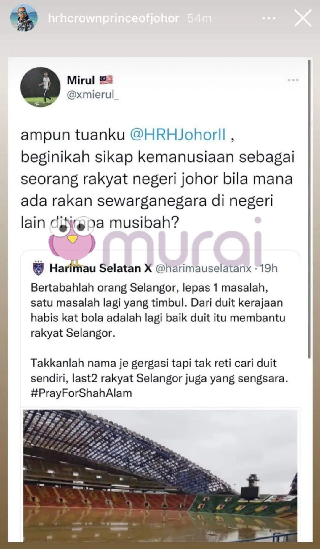 As reported by Murai, a Twitter user named @xmierul_ had called upon the Johor Prince to lead by example. This came after an online page, Harimau Selatan X, came up with a post, apparently mocking the flood disaster that occurred in Selangor recently.