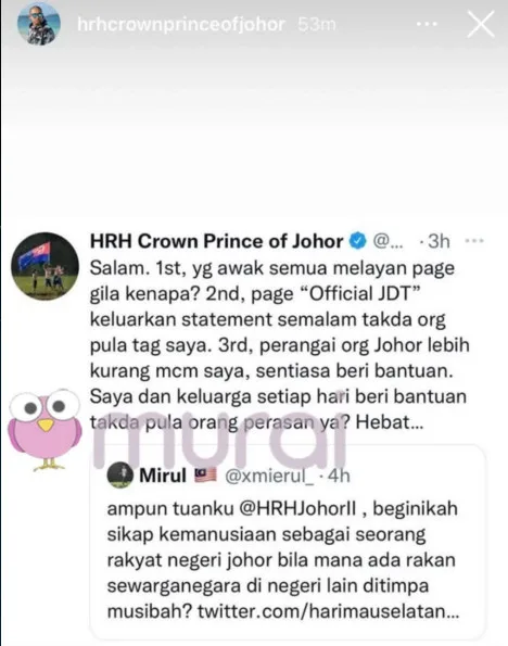 Tunku Mahkota Johor, Tunku Ismail Idris ibni Sultan Ibrahim, took to his social media to issue his direct response to a netizen who questioned the humanitarian attitude of the people of Johor when other states were being affected by the recent flooding.
