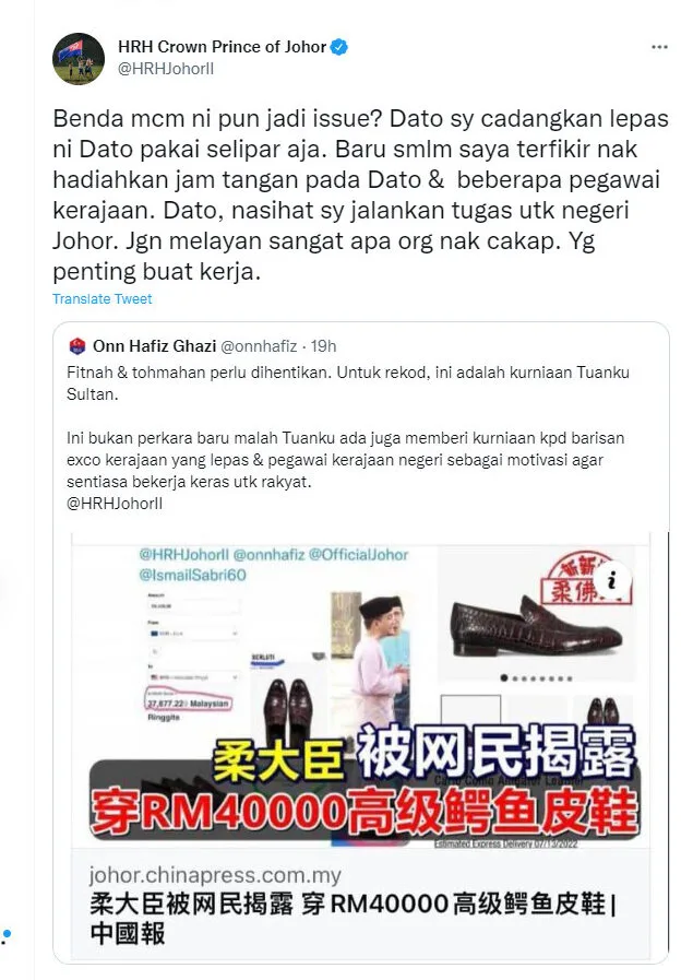 This has in turn caught the attention of the Sultan’s son, Tunku Mahkota Johor, Tunku Ismail Idris. The Johor Prince took to his Twitter to address the ongoing commotion on social media over the local politician’s hefty Berluti shoes. In this case, TMJ couldn’t help but to express his confusion about the matter.