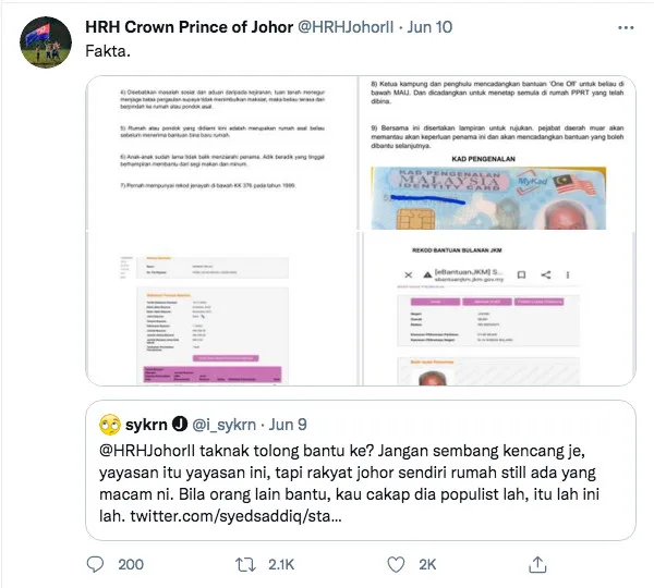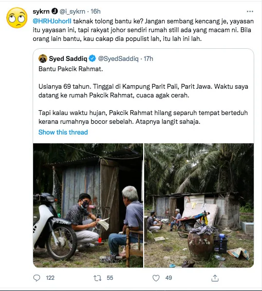 In the posts, the Muar MP also revealed that he managed to lend a helping hand to the poor uncle. However, things took an exciting twist when Twitter user Sykrn chimed in and questioned Tunku Mahkota Johor, Tunku Ismail Idris, on why he didn’t provide any assistance to Pakcik Rahmat.