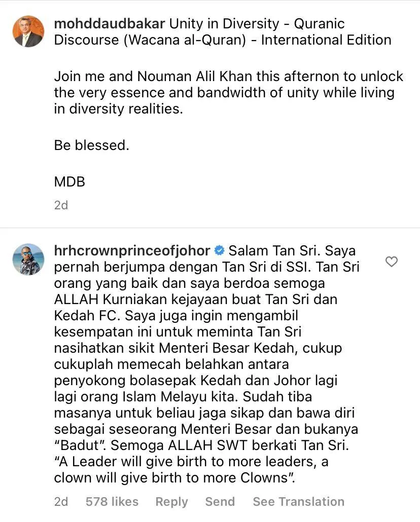 Recently, the Johor Prince was spotted leaving a remark on Datuk Dr. Daud Bakar’s IG post. In the post, TMJ has called for Kedah Darul Aman FC’s owner to advice Sanusi. This apparently came after the latter made a sarcastic comment about JDT FC’s win over KDA FC during the Super League football match earlier this week.