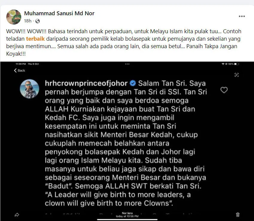 “Tell (Sanusi) to stop tearing apart Johor and Kedah (FC) supporters, especially among the Muslims and Malays. It’s time for him to check his attitude and behave like a real Minister; not be a clown. ‘A Leader will give birth to more leaders; a clown will give birth to more clowns.'” the JDT FC owner added in his comment.