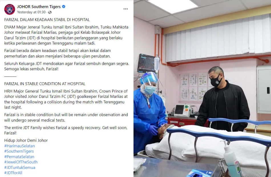According to a post shared on Johor Southern Tigers’ Facebook page, they informed that Farizal is currently in a stable condition. It is understood that the 35-year-old will be remaining under observation and will undergo several medical tests. As seen in the photos shared online, Tunku Mahkota Johor (or TMJ in short) was also spotted spending some time with the player at the hospital.