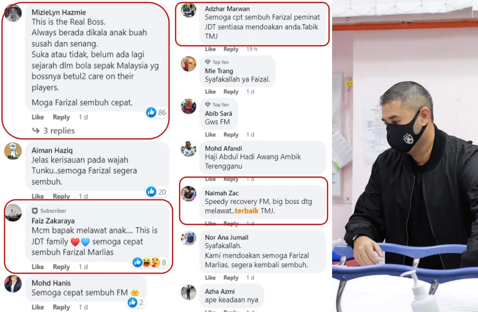 The comments section on the Facebook post has been flooded with netizens wishing Farizal a speedy recovery. Others also reacted positively to TMJ’s effort in ensuring the welfare of the JDT team players. FB user MizieLyn Hazmie wrote, “This is the real boss. He’s always there for the players during the hard times and also the good times. You like it or not, this is the first time in the history of Malaysian football scene where the boss shows that they really care about the players.”