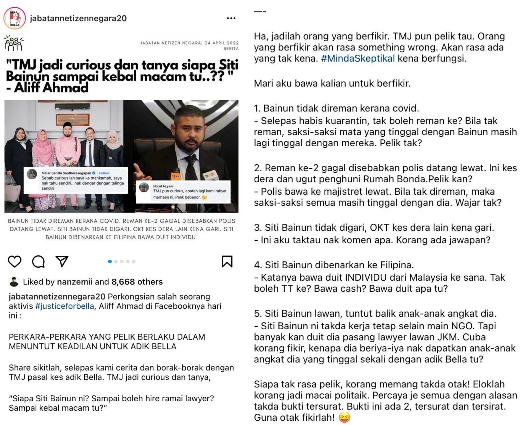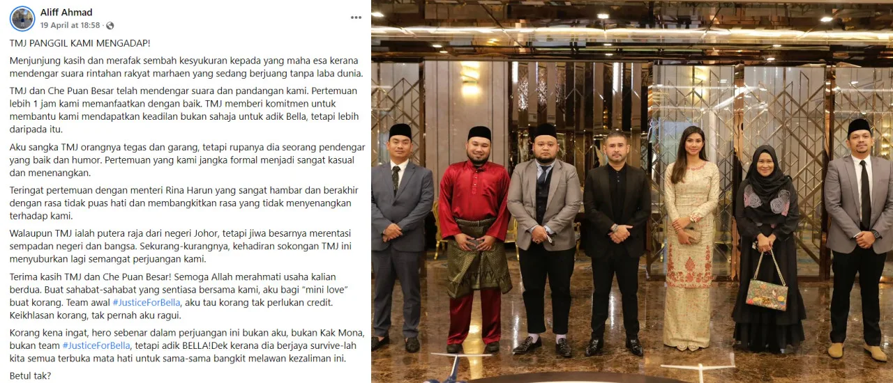 In a more recent update, TMJ recently met up with his team of lawyers as well as a few activists who are currently fighting for the #JusticeForBella movement. One of the activists, Aliff Ahmad, took to his Facebook to share what went down during the meeting. It was also posted on Jabatan Netizen Negara’s Instagram page.