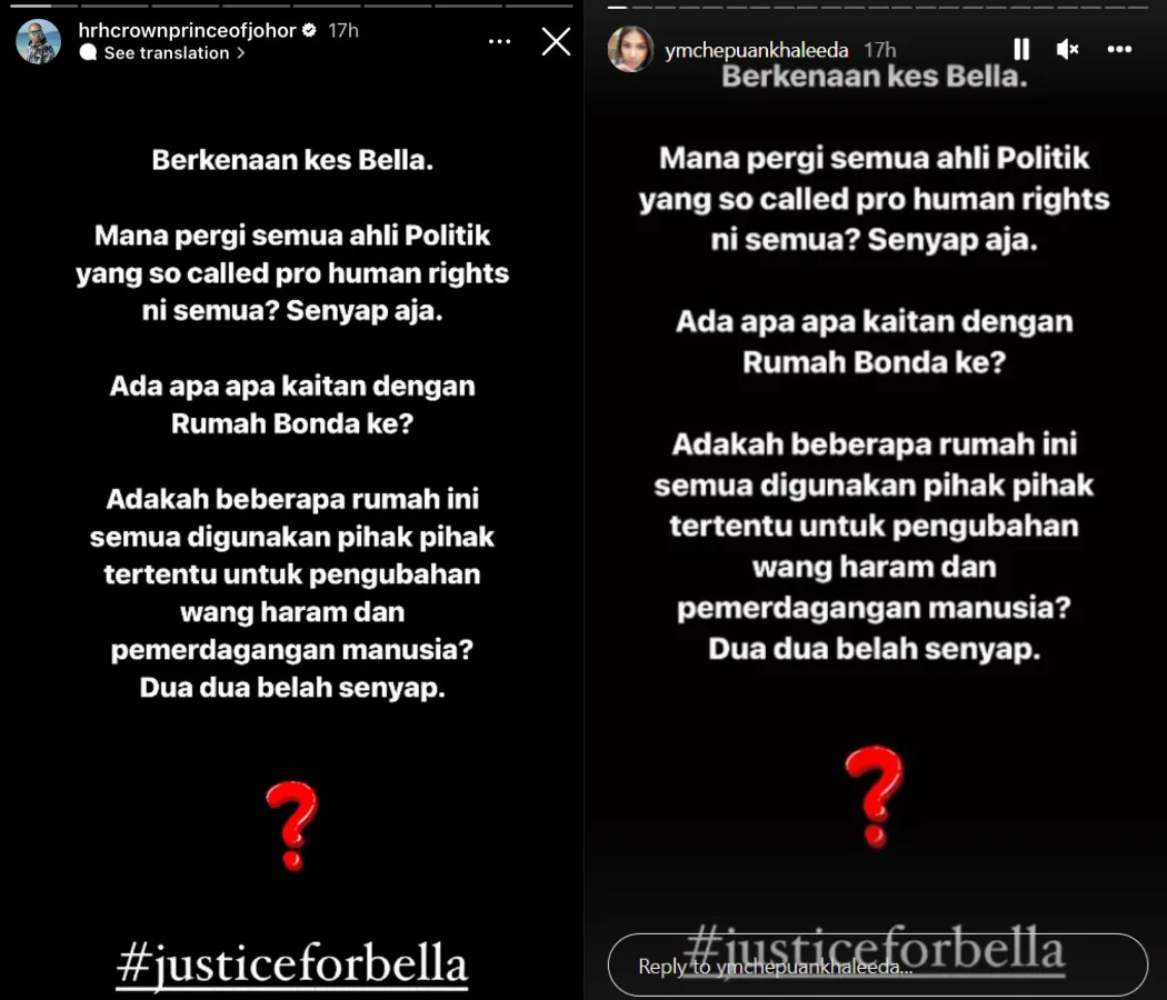 Just when we thought it ended there, it appears that the 38-year-old prince has more to say about the alleged abuse case. “Where did all the so-called pro-human rights politicians go? Why are they being so quiet? Do they have any connection with the Rumah Bonda? Are some of these (welfare) houses being used by certain parties for money laundering and human trafficking? Both sides just went silent,” TMJ wrote in an IG Story post.