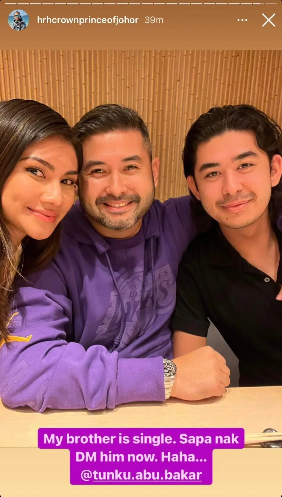 The spotlight, though, is on the caption shared by TMJ on his IG Story post. “My brother is still single. Anyone who’s interested can DM (direct message) him now. Haha, @tunku.abu.bakar” the 37-year-old wrote.