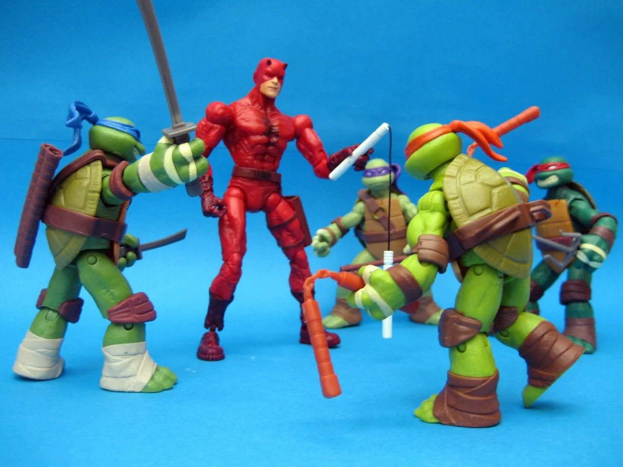 The connection between “Daredevil” and ‘TMNT’ is particularly striking. “Daredevil” had existed for 20 years before the Teenage Mutant Ninja Turtles showed up in the 80s. In the Marvel comic, Matt Murdock saves a blind man from a speeding car and is struck in the side of the head by a radioactive canister, which blinds him but makes his other senses more powerful. According to the Turtles’ backstory, the same radioactive canister then rolls into a sewer and bathes them in glowing, green goo, transforming them into the masters of ninjutsu we know and love today.