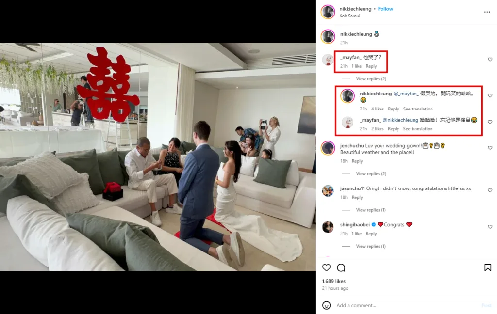 One of the pics uploaded showed the couple carrying out the tea ceremony, allegedly in the Leung family’s living room, with Tony and his wife seated on the couch. The photo captured Tony looking despondent and reluctant as he accepted the cup from his new son-in-law.