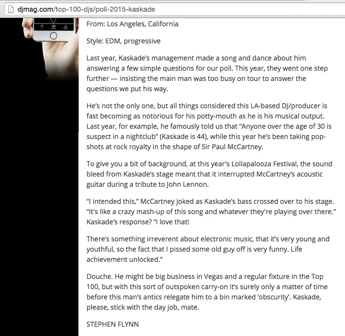 In a DJ Mag “Top 100 DJs 2015” biography entry for Kaskade, a writer called the DJ/producer out to be a douche. This is, of course, after calling him a potty-mouth and telling him to “please stick with the day job, mate.”
