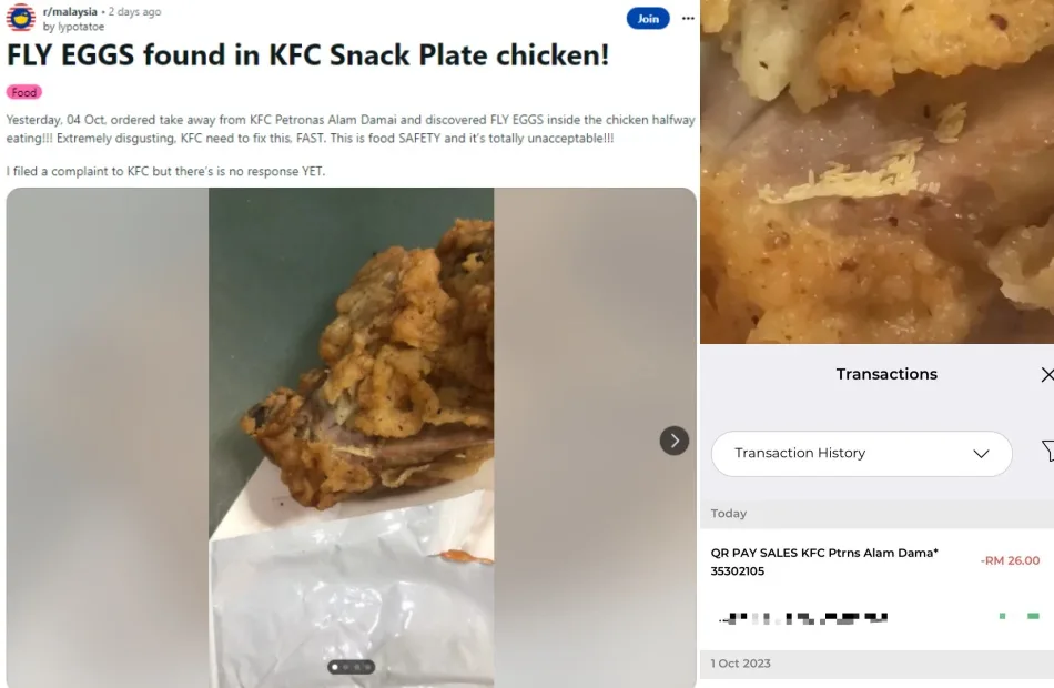 Earlier this week, Reddit user @lypotatoe posted several photos of their KFC chicken meal that was ordered from the Alam Damai Petronas station. The photo in the first showed nothing out of the ordinary about the fried chicken but a zoomed-in photo in the next slide revealed that the meal apparently had fly eggs in them. Unfortunately for the customer, they made the horrific discovery after the chicken had already been half-eaten.