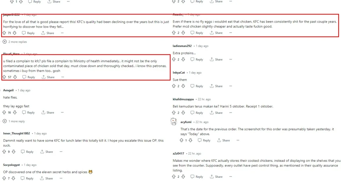 In the comments section, @lypotatoe updated that the KFC outlet called and apologised for the incident. The Reddit user also claimed that the fast-food chain requested to retrieve the contaminated chicken for investigation, which led some to suspect that the company may want to dispose of the evidence.