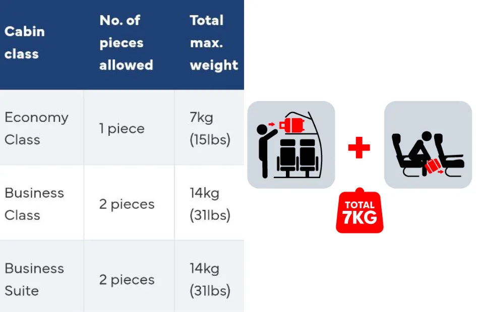 Each airline has specific weight and size limits for both cabin and checked luggage. Generally, economy class passengers are limited to one carry-on bag of up to 7 kg, while business and first-class travellers can bring two bags weighing up to 14 kg in total.