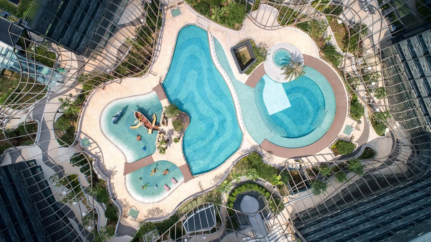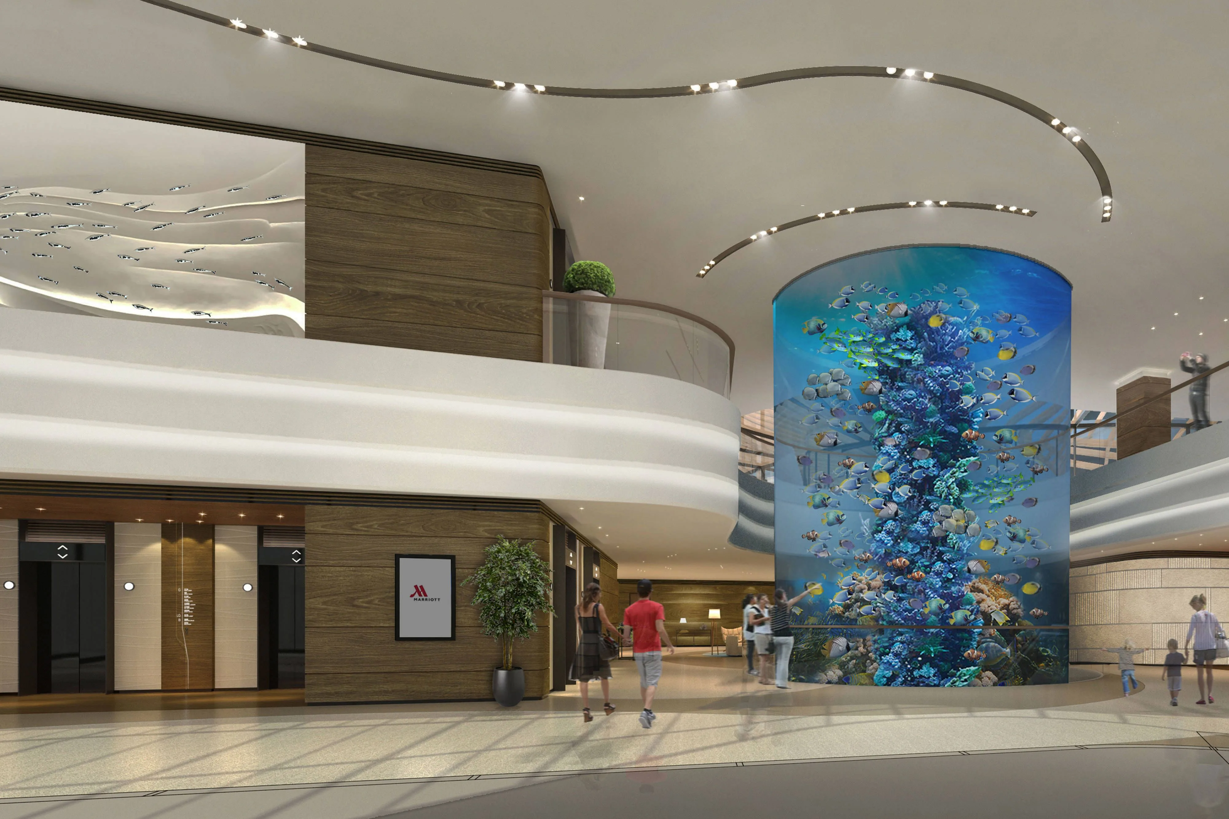 Designed by Aedes, Hong Kong Ocean Park Marriott Hotel feels like a modern urban green oasis. It is made up of 3 architecturally iconic towers – the Pier Wing, Club Wing and Marina Wing – with amazing environmental features. Upon entering the lobby, you’ll notice a 16-metre floor-to-ceiling aquarium that is 3 floors tall. When you visit, you may see the salt-water aquarium filled with thousands of fishes (including thorn fish, butterfly fish, puffer fish, and more).