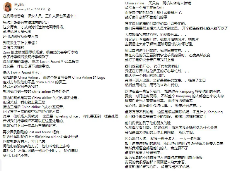 Kedah-born travel blogger Ong was returning to Malaysia from Taiwan on 24th February. He landed in Penang International Airport via China Airlines in the afternoon and as usual, went to collect his luggage. But to his shock, he found a split in his suitcase. Ong claims damaged luggage isn’t uncommon. So, he sensibly went to file a damage report with China Airlines at their counter.