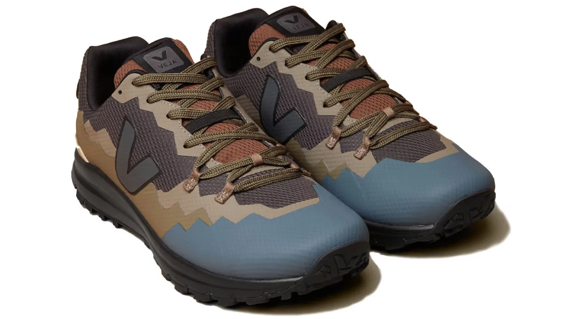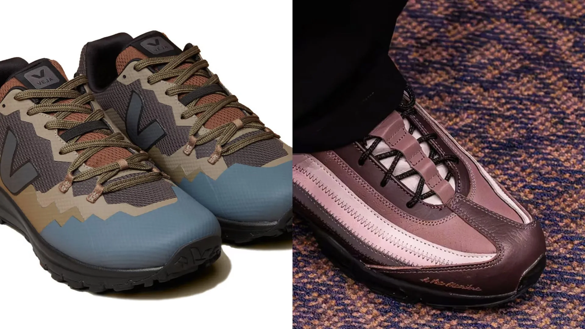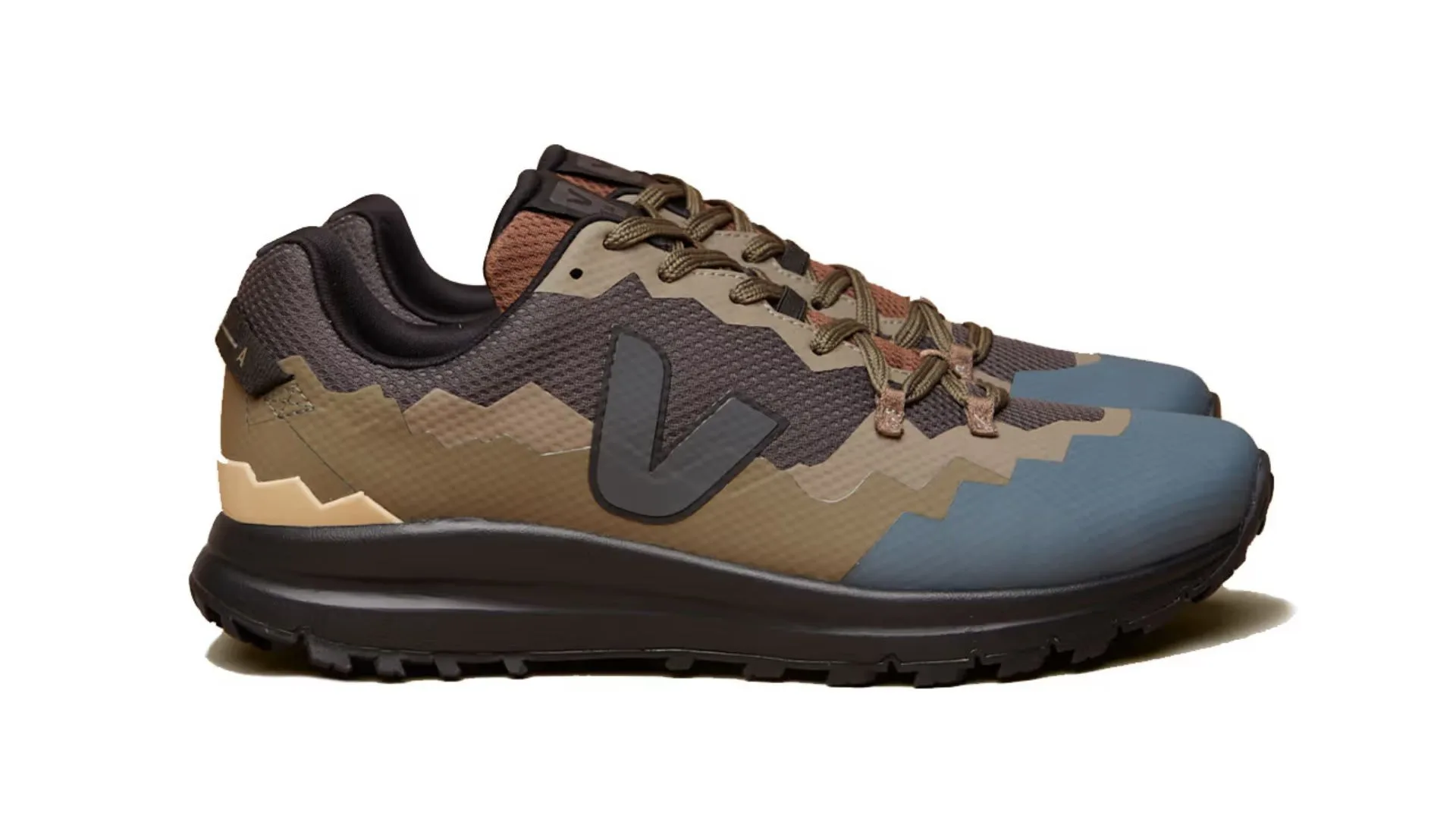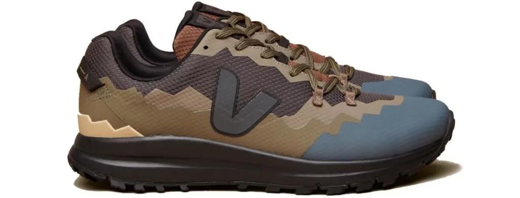 The offering is modelled after VEJA’s Fitz Roy hiking shoe and has a multicoloured look that is reminiscent of rock formations. This collage-style design covers the entire upper of the shoe, with earthy tones inspired by the Amazon rainforest and a hint of muted blue tones complementing each other.