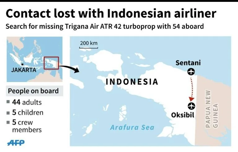 The ATR42-300 twin turboprop plane was carrying 44 adult passengers, 5 children and infants, and 5 crew. It took off from Sentani airport in Jayapura, but lost contact with ground control half an hour later at 2:55pm.
