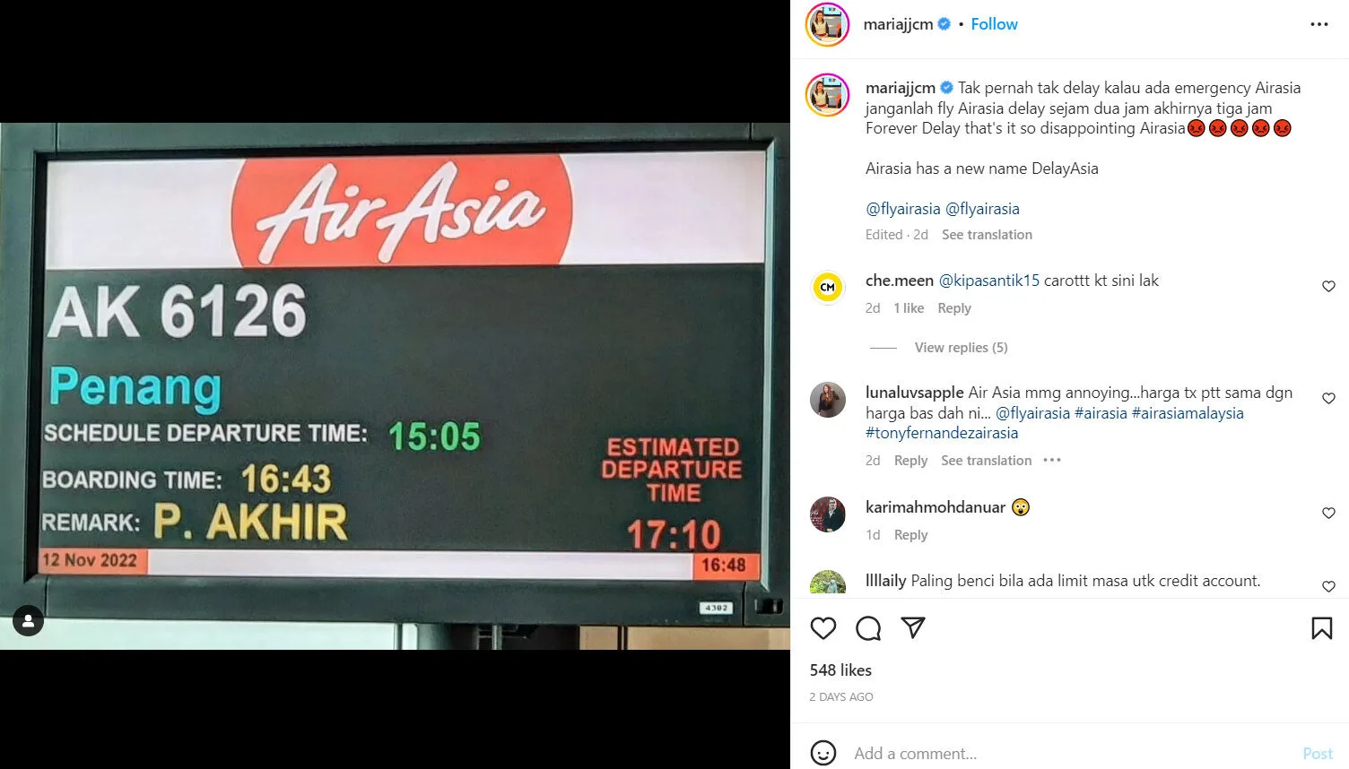 “There’s always (a) delay, even during (an) emergency. Please don’t fly with AirAsia. They always delay their flights by an hour, two hours, and in the end, three hours. Forever delay. That’s so disappointing AirAsia,” Maria wrote. “AirAsia has a new name, DelayAsia.”