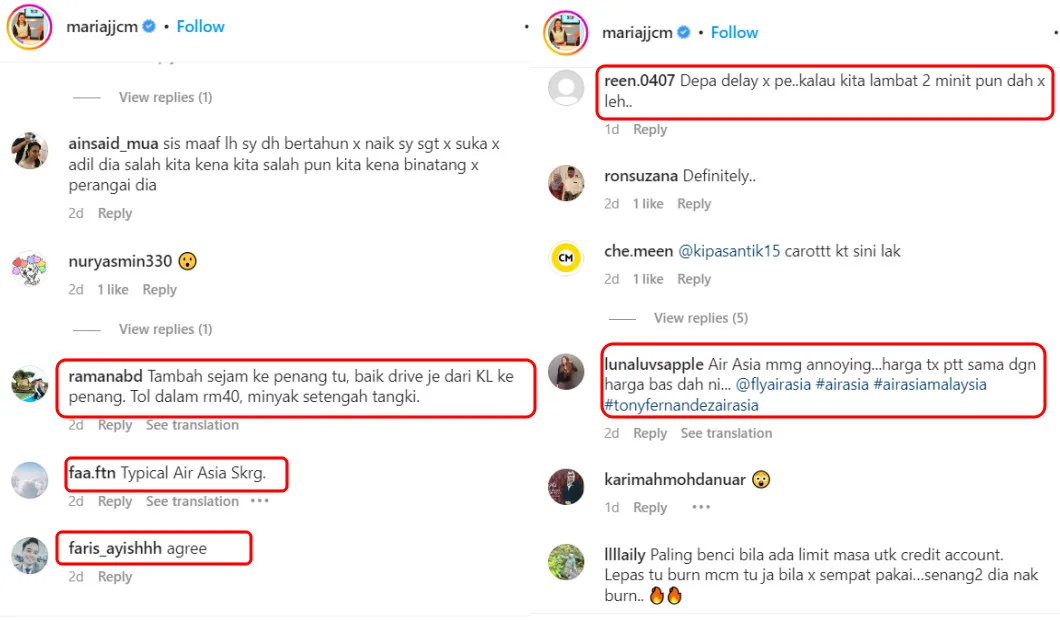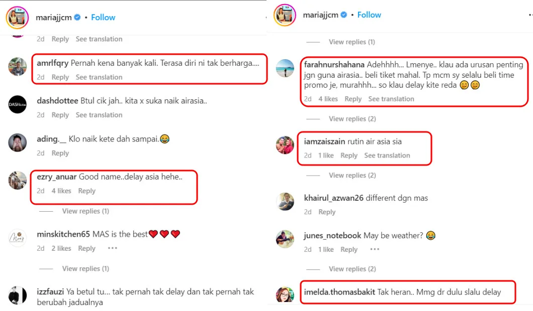 Many netizens took to the comments section to share their thoughts on the matter. Most of them appeared to agree with Maria’s point. “Oh dear, that’s quite a long time. If it’s urgent, just don’t travel with AirAsia. The tickets are very expensive. I only buy the tickets during promotional seasons, it’s cheaper. I still can accept it (then) if they delay their flights,” one netizen named @farahnurshahana wrote.