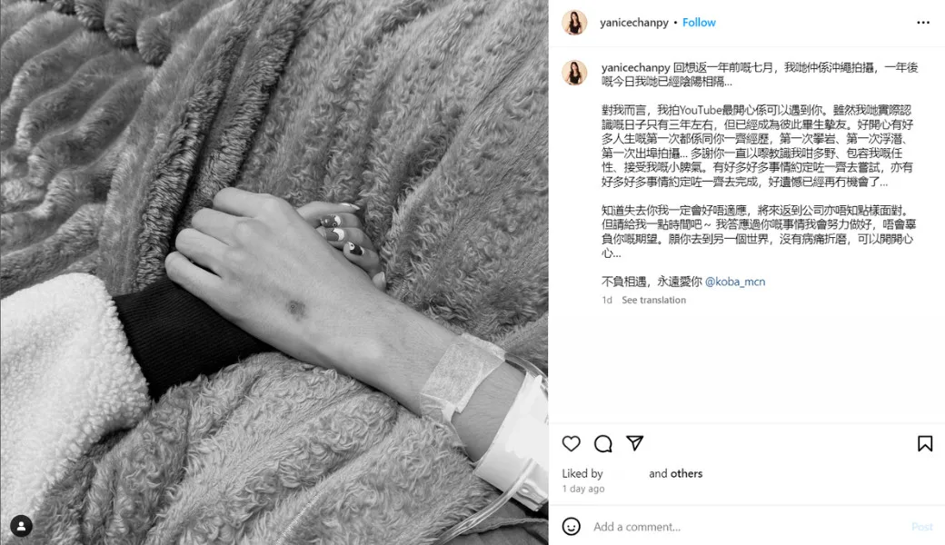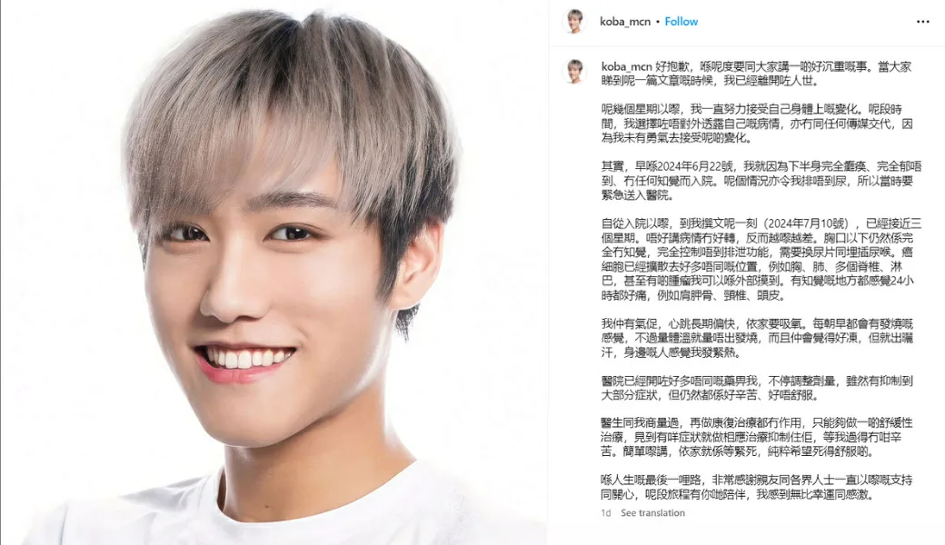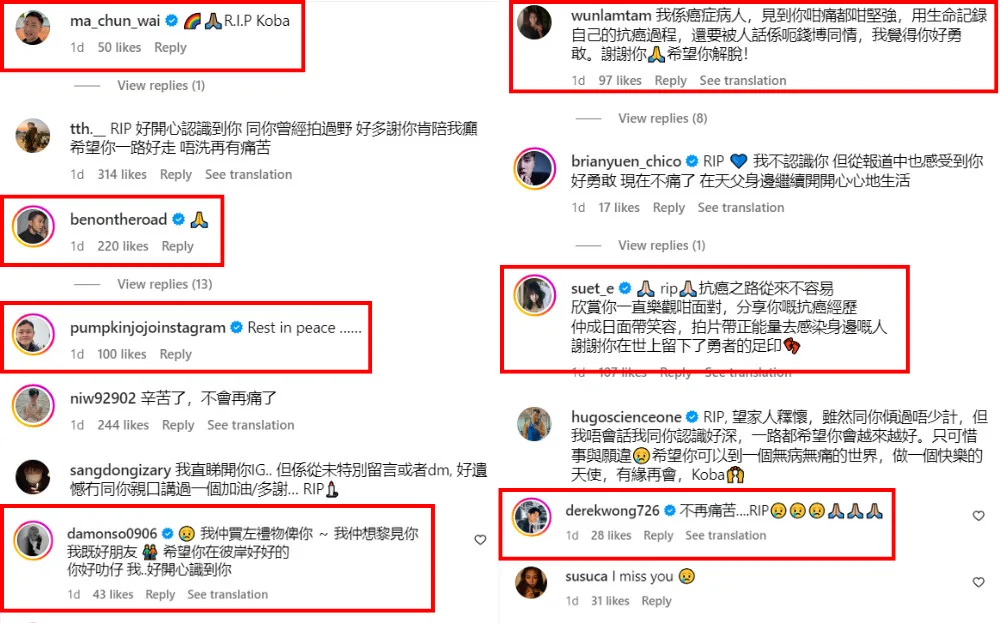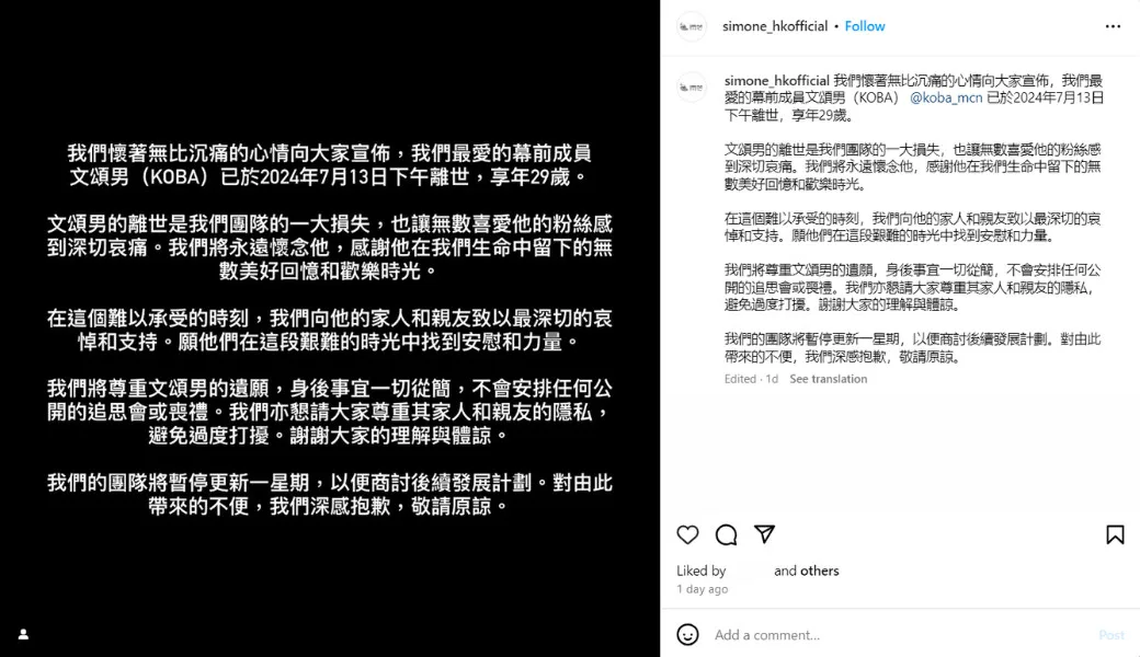 Fans have taken to Koba’s post to mourn his death, sharing their sorrow for his passing. Fellow celebrities have also extended their condolences through social media, including actors Steven Ma (馬浚偉) and Benjamin Yuen (袁伟豪). Koba’s “Simone” co-host, Yanice Chan (陳栢昕), also shared a lengthy post on Instagram following his death, thanking him for being a good friend over the years and wishing the late star can finally rest in peace after a painful battle.