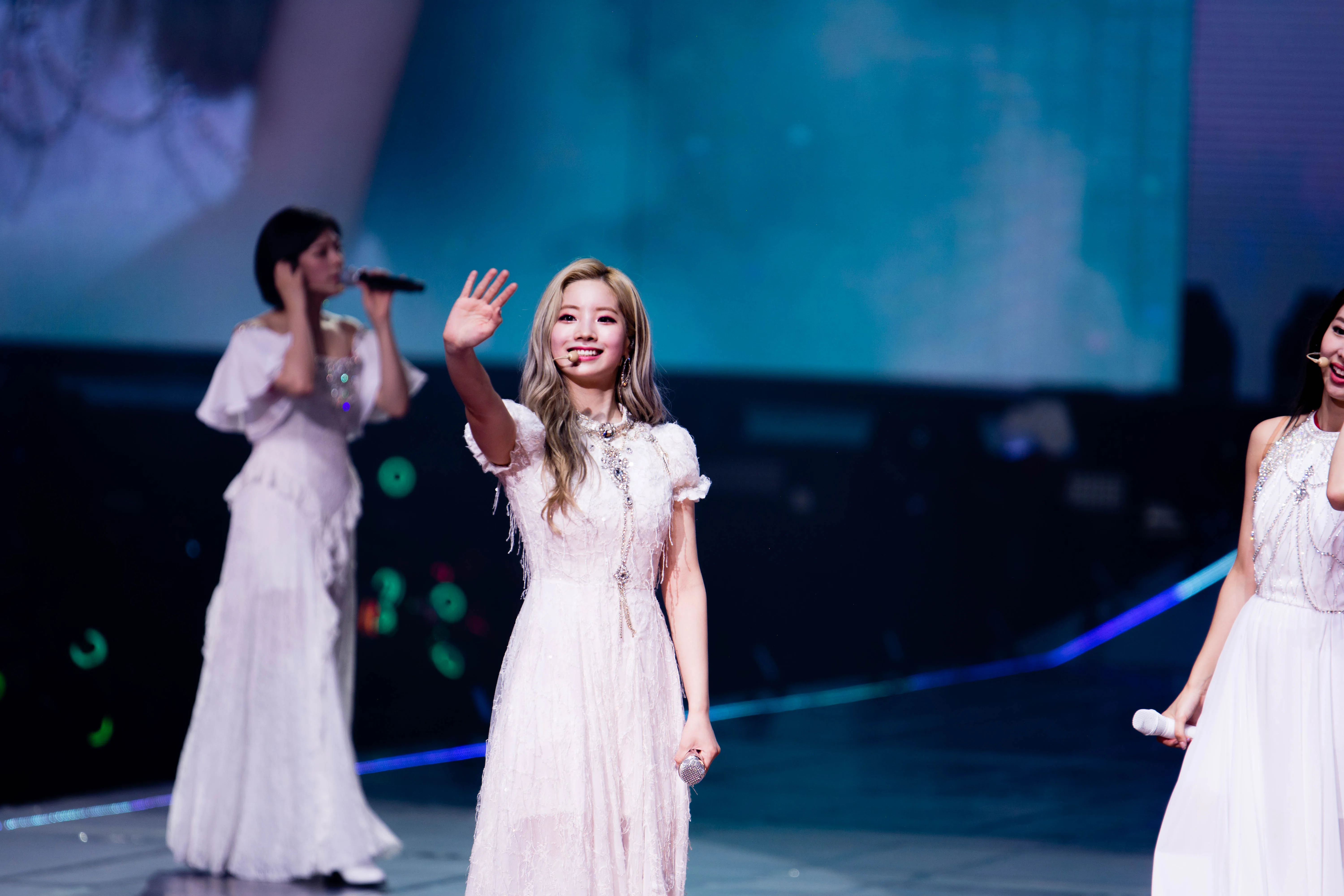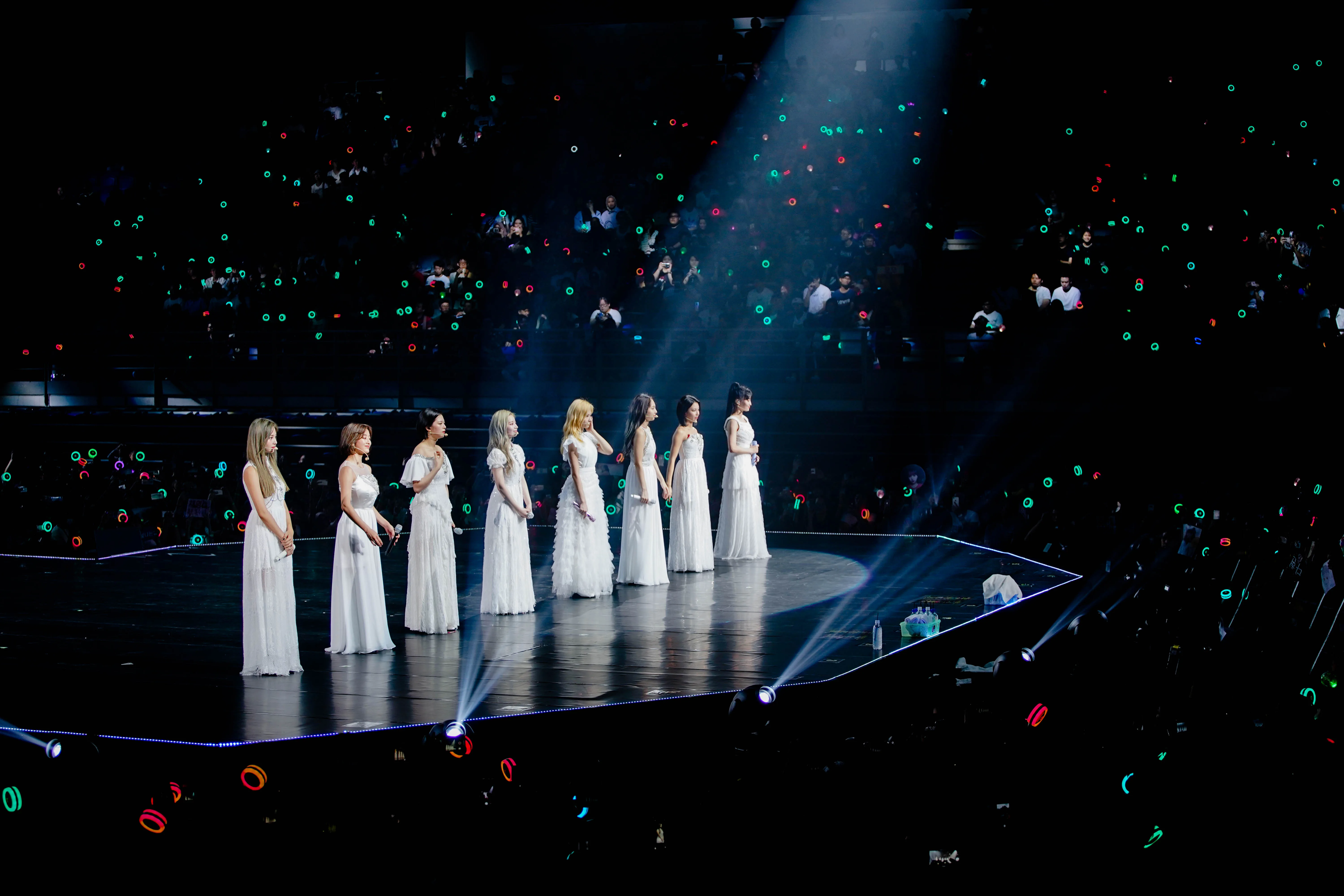 A VCR plays, showing the TWICE members in a soft, angelic glow as they look seductively at the camera. The fans proceed to passionately cheer every time Mina is shown; it’s one of the few times fans get to see her tonight after all. Focused on the VCR playing at the main stage, fans were caught off guard as the girls made their way up to the extended stage instead. Draped in mesmerising long white gowns, they began singing the gentle ballad, “After Moon”. During this time, the Candy Bongs (TWICE’s official lightstick) in the hand of ONCEs glowed a bright mint/turquoise – the colour representing the absent member, Mina.