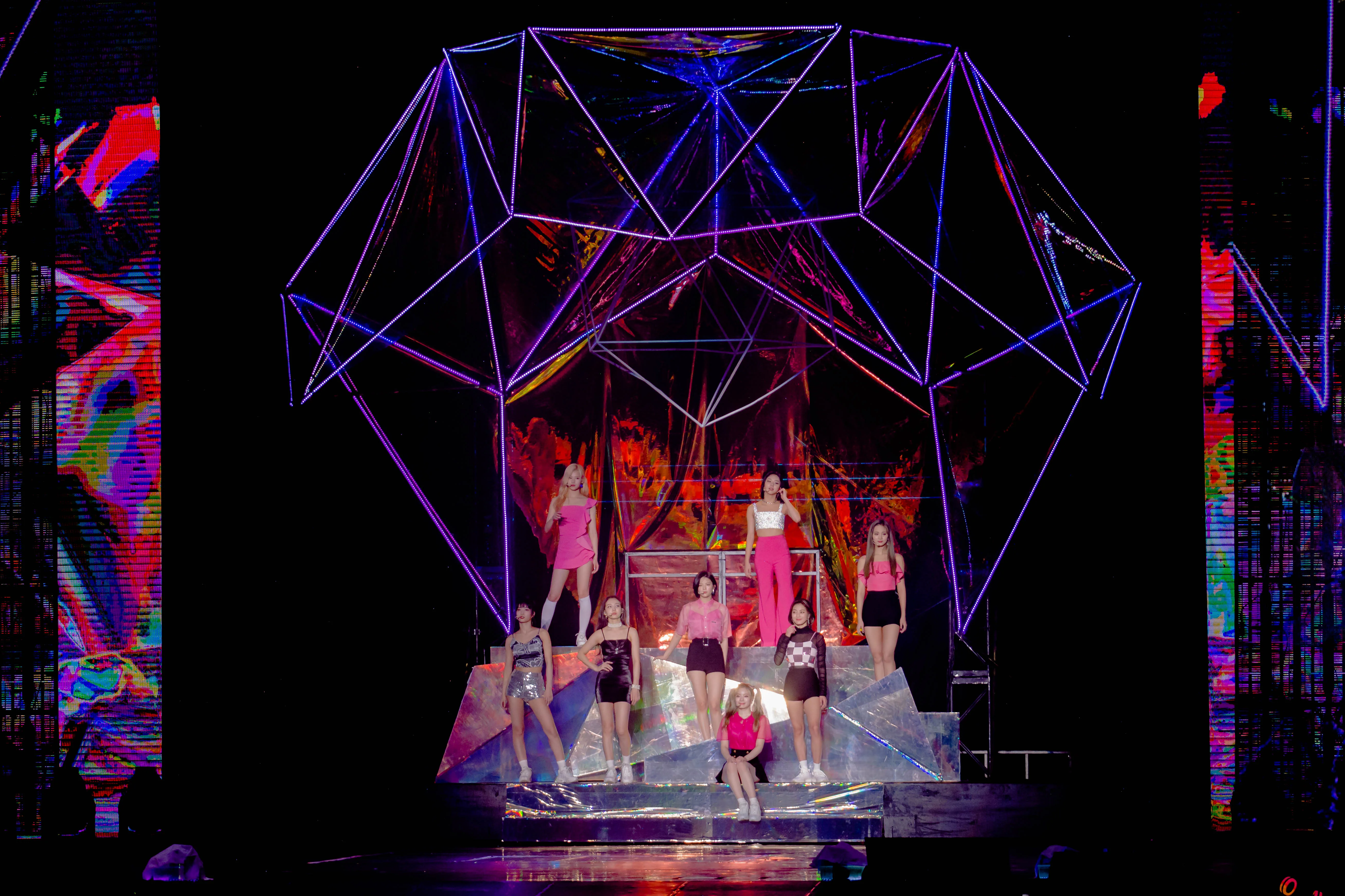 The opening visual showed a mysteriously masked woman walking towards an arcade machine. Upon activating the machine, she materialises the TWICE members one by one as fans scream for the members appearing on screen. After a bit of a light show and more visuals displayed on screen, Jihyo, Tzuyu, Chaeyoung, Momo, Jeongyeon, Sana, Dahyun and Nayeon are elevated onto the stage. We see an image of the members behind where each of them stand and a gap where Mina would be. But that solemn realisation is quickly set aside as the group opens with a powerful performance of “Stuck In My Head”.