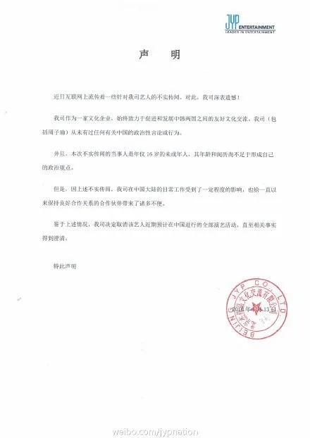 JYPE is a multi-cultural company. We have always tried to encourage and further Sino-Korea cross-cultural interaction. Our company (including Tzuyu) has never engaged in political debate and has never taken a stance regarding Chinese territorial issues.